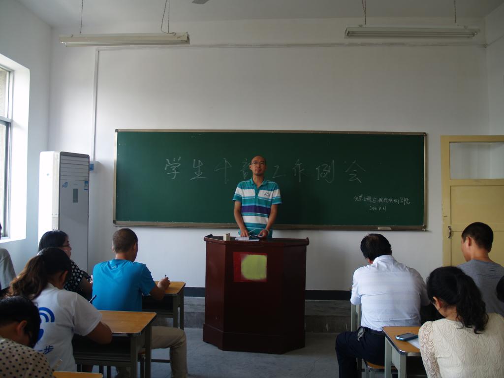 为提高学生干部能力,加强自身素质,更好的迎接本科评估工作,我院新学期第一次学生干部培训会议于2014年8月31日在5号楼407教室召开。参会人员有化材院党总支书记刘全民老师、团总支书记武永耿老师、高霞老师、叶春老师、柴文耕老师以及各年级主要学生干部,会议由武永耿老师主持。