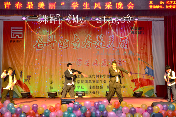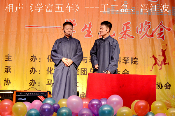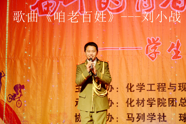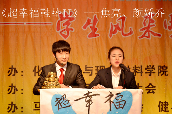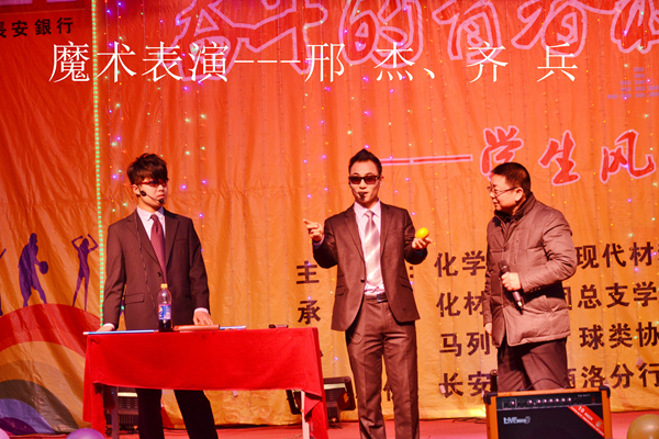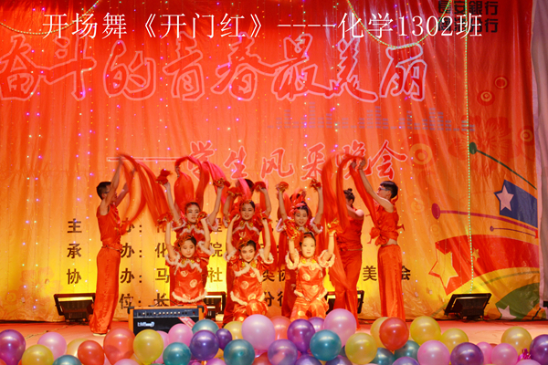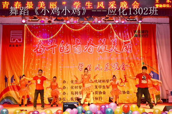 舞起醉人的红绸,敲响震天的锣鼓,伴随着舞蹈《开门红》,晚会正式开始。开场舞«开门红»令广大师生感受到了新年临近的喜庆。王强等同学的街舞秀引爆全场。王老师的«西部情歌»令同学们为之喝彩。相声«学富五车»令全场笑声不断。小品«我爱化学»则将化材院的专业以艺术的形式呈现给大家。更有武永耿等老师与同学们合演的舞蹈«小苹果»,让大家大饱眼福。