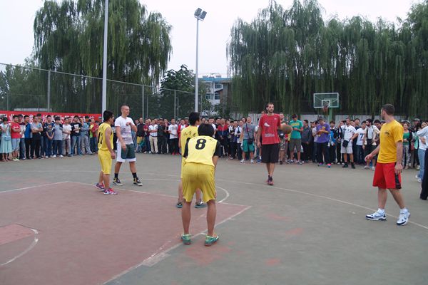 9月19日下午五点半,欧美职业篮球对抗队应邀与我院篮球队友谊赛在操场进行。