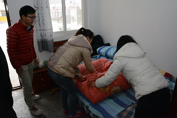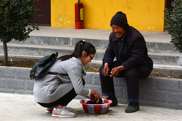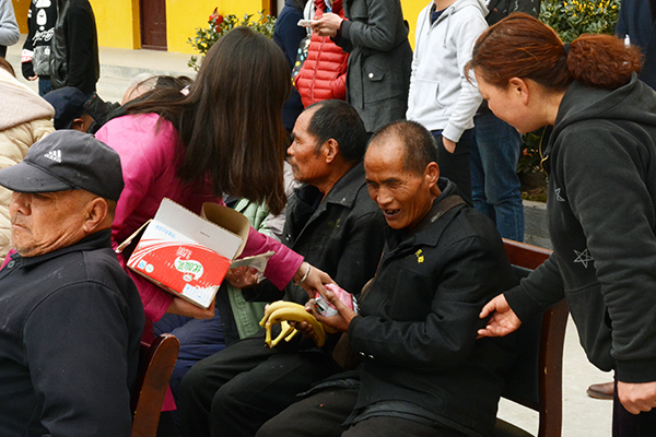 同学们怀着诚挚之心,带着慰问品来到敬老院,老人们热情欢迎同学们的到来。志愿者的到来使原本寂寞的敬老院充满了笑声。同学们表演节目给老人,分发水果等慰问品,陪老人聊天。同学们和老人自由交谈的同时,认真倾听老人们讲述着改革开放前后的个人经历,令同学们了解我们今天的幸福来之不易,同学们也把自己在外读书情况以及自己家乡情况给老人们一一讲述, 一边跟老人谈心一边为老人锤背。同学们与老人们进行的“歌曲互动”让老人和同学都言笑晏晏。最后,同学们为老人们打扫宿舍卫生,擦桌子、拖地、擦帘子等。屋外寒风阵阵,屋内暖意融融,活动在大家的欢声笑语中圆满结束。