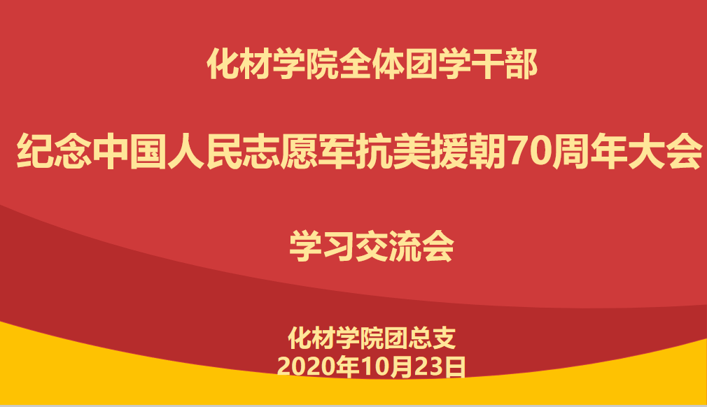 为深入学习贯彻习近平总书记在纪念中国人民志愿军抗美援朝出国作战70周年大会上重要讲话精神,使全体学生继承抗美援朝精神,铭记党和国家的伟大胜利,积极投身党和国家的伟大事业,号召全体学生进一步坚定“四个自信”,牢固树立“四个意识”,自觉做到“两个维护”,化材学院团总支于2020年10月23晚6:30在丹江校区多媒体1室组织全体团学干部、各班班干部集中观看了纪念中国人民志愿军抗美援朝出国作战70周年大会。
