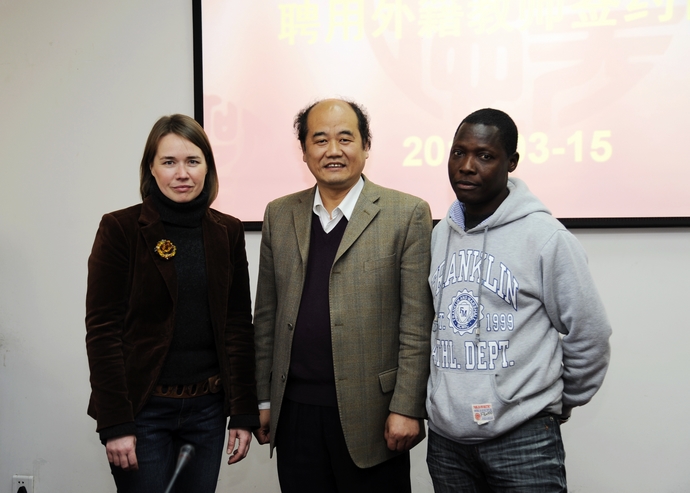 3月15日下午,我院举行聘请外籍教师签约仪式,副院长刘建林代表学院与外籍教师Laima(立陶宛)、Hillary(喀麦隆)签订了聘用合同。学院办公室、教务处、外语系相关负责人参加仪式。